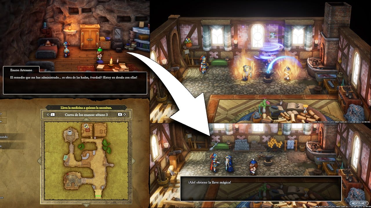 A continuación, ve al sur de dicho jardín y al fondo del lugar, verás unas escaleras que llaman la atención por el porche que las rodea. Baja por ellas y allí habrá un anciano en una habitación situada detrás de una puerta azul. Atraviésala, habla con él y después de un evento relacionado con por qué está ahí, te entregará la Solerroca, un objeto que necesitarás para poder avanzar en la trama más adelante.