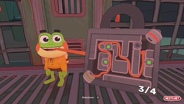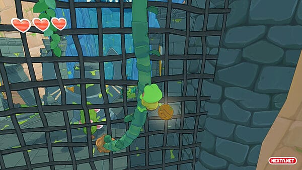 Hop es una rana un poco peculiar. No se le da muy bien ni nadar ni trepar (aunque desbloqueamos y mejoramos estas habilidades a lo largo de la aventura), aun así, su capacidad para correr, rodar, saltar o incluso deslizarse por las paredes es envidiable. Y es que, de lo primero que nos daremos cuenta al empezar a jugar es lo bien que se controla. Sus movimientos pueden acumular velocidad, afectando directamente a la distancia que recorremos al saltar y al deslizarnos corriendo por las paredes al más puro estilo Prince of Persia. Y todo esto sin estar teniendo en cuenta su lengua… Nuestro protagonista utiliza su lengua como si de una extremidad más fuera: abrir cofres, agarrar objetos lejanos, balancearse para superar obstáculos o incluso resolver rompecabezas.