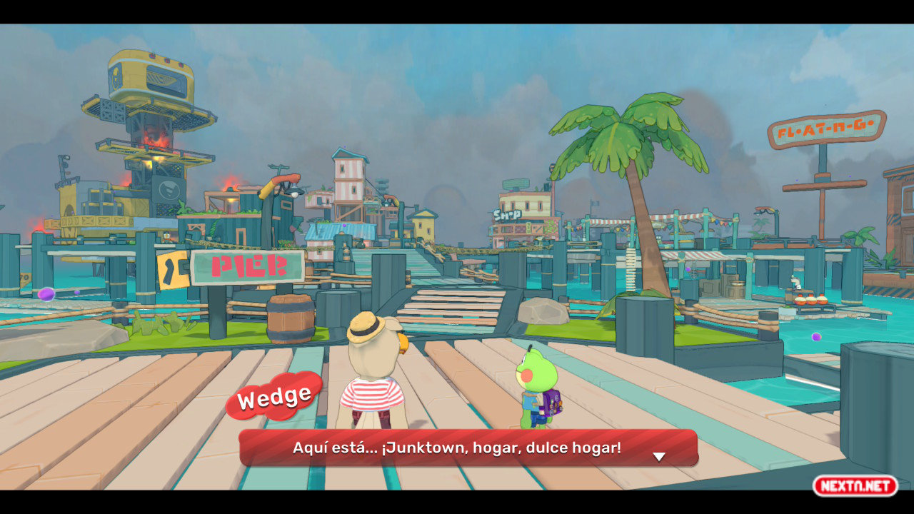 Pese a sus amenazas, optamos por intentar regresar a casa por nuestros propios medios, aunque la cosa está difícil. Nos ha arrastrado a otro mundo (como si estuviéramos viviendo una versión invertida de la serie Anfibilandia) y regresar a casa andando parece algo totalmente inviable. La primera y única posibilidad que se nos presenta es confiar en un mapache mecánico llamado Copper, que cuenta con una aeronave a la que le faltan algunas piezas para funcionar. ¿Es un plan infalible? ¡No! Pero es lo que tenemos y solo necesitamos conseguir tres piezas de aeronave. No puede ser tan difícil conseguir repuestos, ¿no? Por suerte, y porque está seguro de que nuestro plan no va a ninguna parte, Diss decide no interponerse en nuestra nueva búsqueda siempre y cuando también busquemos lo que él quiere, unos misteriosos objetos llamados Drip Oscuros (aunque no nos quiere decir que uso les va a dar o para qué los necesita). Obviamente, a Hop le parece que aquí hay mosca encerrada.