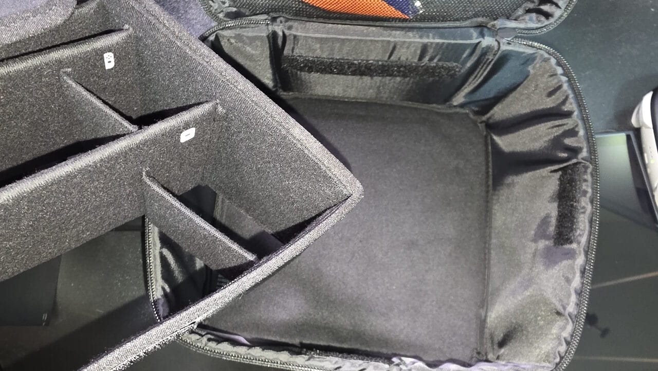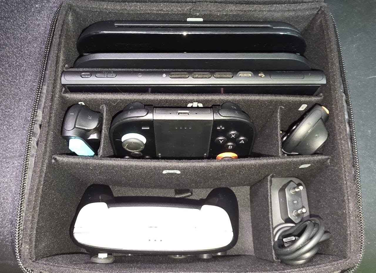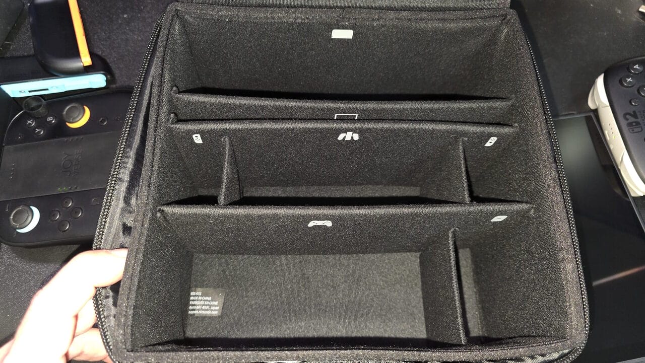 Con un espacio alargado para llevar nuestra Nintendo Switch 2 con los Joy-Con 2 desacoplados y totalmente protegida. Justo detrás de ella, tenemos un espacio para guardar el grip oficial de Nintendo Switch 2, y a los lados de este hueco tenemos dos en los que podemos insertar cada Joy-Con 2. También tenemos un espacio para un Mando Pro de Nintendo Switch 2 (o cualquier otro compatible), otro para el cargador y, frente a la consola, un lugar donde el Dock encaja a la perfección.