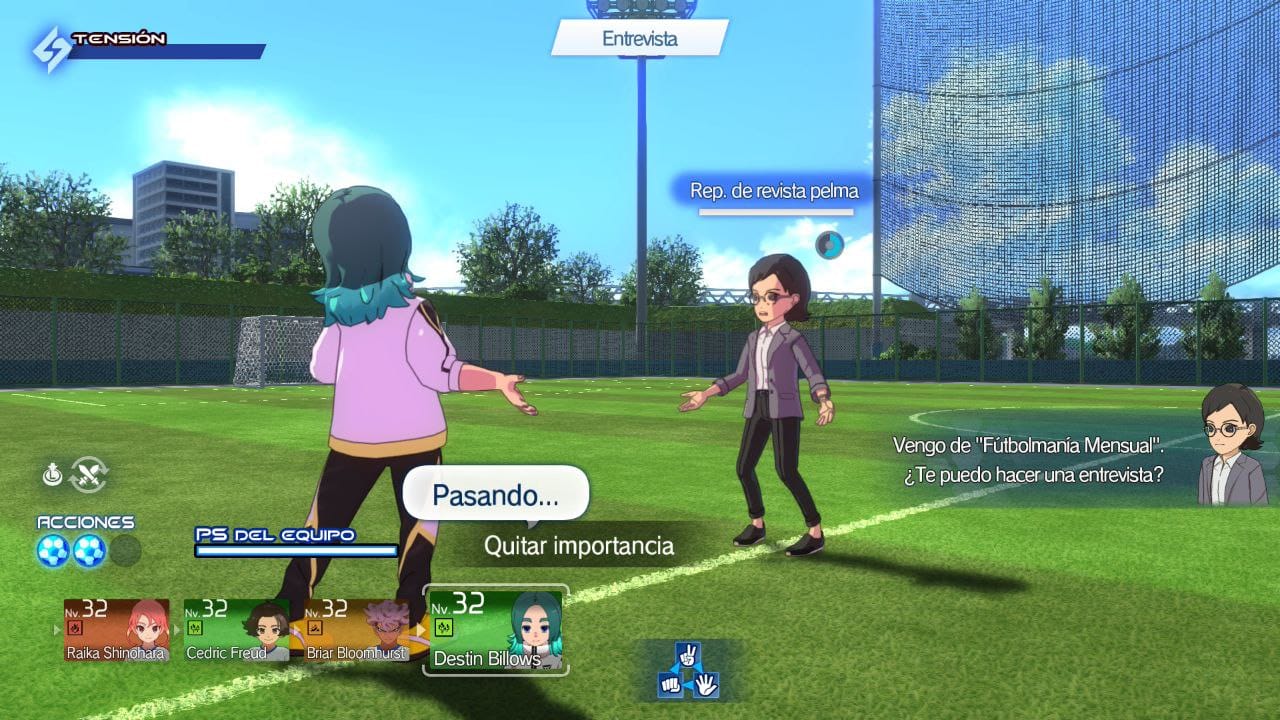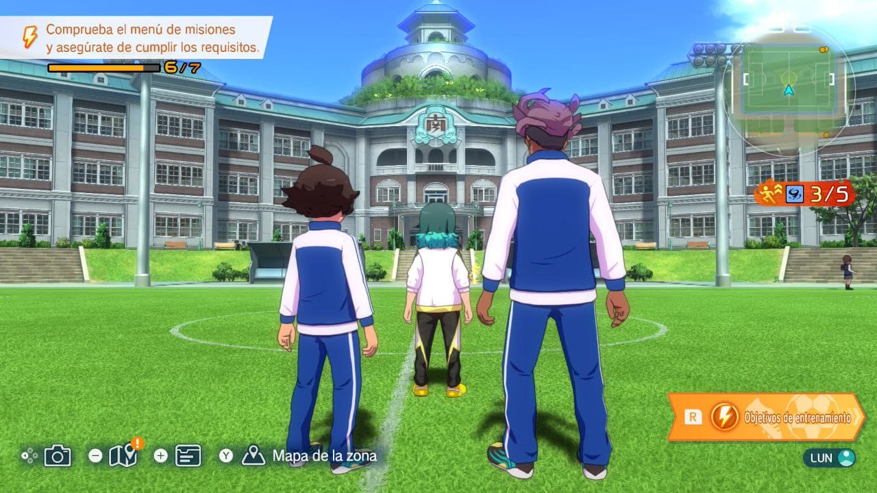 Este modo historia también explora algunas mecánicas adicionales muy interesantes, como combates estilo JRPG estándar en el que usamos argumentos o acciones (con el sistema de piedra, papel o tijera como base) para convencer o evitar a ciertas personas o que debamos reunir información para entender mejor una situación antes de continuar. Lo malo de todo esto es que son mecánicas que se dejan a un lado muy pronto. Antes de empezar a jugar ya te avisan de que tardarás un poco en jugar al fútbol y es cierto: hasta el capítulo 3 no juegas ningún partido ni pachanga. Pero una vez llegamos a ese punto, todo lo demás queda relegado a un segundo plano casi al instante, haciendo que el progreso se centre principalmente en los partidos y los entrenamientos. Y este aspecto es muy importante ya que, de cara a cada gran partido del capítulo, se nos establecen objetivos que debemos cumplir para poder jugar, ya sea obtener un nivel determinado, aprender técnicas o estrategias concretas o usar a personajes determinados. Es aquí donde se ofrece libertad para recurrir a los diferentes minijuegos o explorar la ciudad sabiendo hasta qué punto debemos entrenar para ganar. No todo es tan bonito, ya que este sistema se puede hacer algo pesado cuando ves que tienes que llegar a cierto nivel de ataque y defensa y eso supone jugar muchos partidos y entrenar bastante.