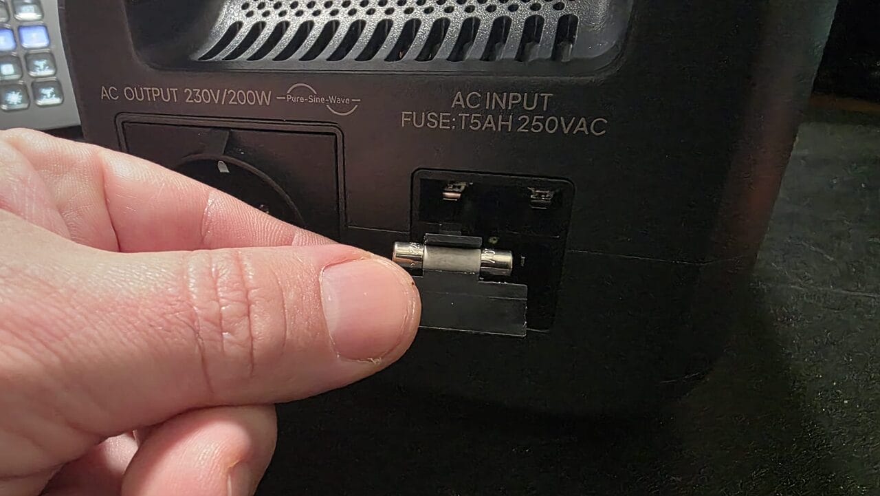 Por cierto, la seguridad está garantizada gracias al fusible T5AH 250VA, un fusible cerámico de acción lenta con capacidad de 5 amperios (5A) y voltaje máximo de 250 voltios en corriente alterna (AC), que actuaría en caso de sobrecarga. Este fusible se encuentra un poco oculto, sobre la toma de corriente instalada para cargar este generador. Es muy fácil extraerlo, así como sustituirlo. Son fusibles de uso común, por lo que son muy fáciles de encontrar.