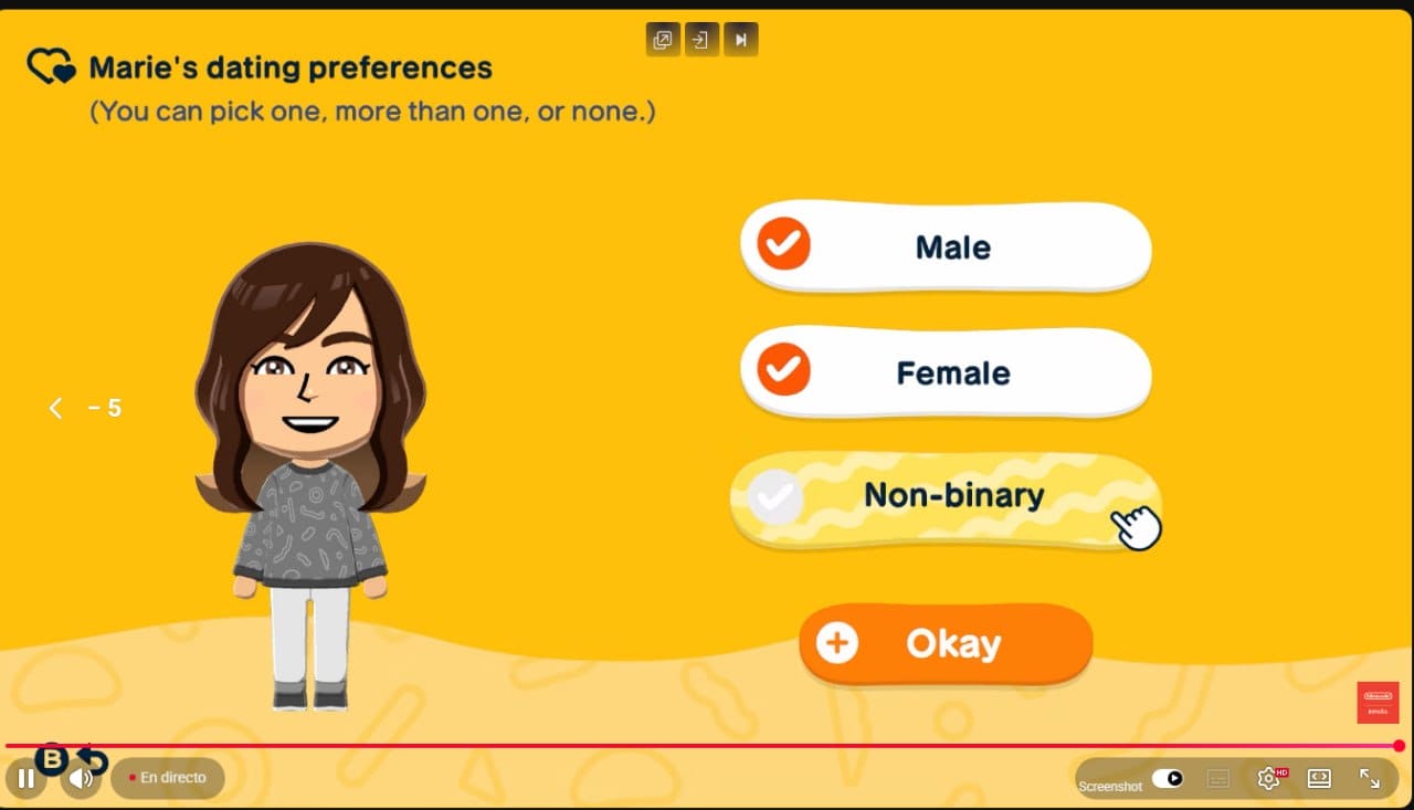 Inmediatamente después, podemos seleccionar el género de los personajes que le pueden interesar a ese personaje nuevo. Por ejemplo, si creamos a una Mii chica, podemos hacer que le gusten los chicos, las chicas, los personajes NB o incluso varios a la vez, introduciendo la posibilidad de que el personaje sea bisexual. Incluso podemos no seleccionar ninguna preferencia romántica, de forma que el personaje sería arromántico o asexual.