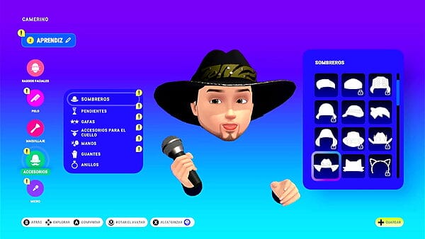 Desde el princpio del juego se puede crear y personalizar nuestro avatar, que consiste en una cabeza y dos manos con un micrófono. Además de pelo, nariz, cejas, ojos, color, también podemos personalizar el micrófono, gafas, guantes, pendientes, anillos, etc… Tenemos una variedad inicial que iremos ampliando conforme subimos de nivel en distintas áreas como el nivel de jugador que aquí se llama Destreza de canto, LSMA, maestría en temas de amor, festivo, pop, etc… Hay bastante variedad de objetos, y se pueden hacer avatares graciosísimos. Sin embargo, el avatar personamente me da algo de grima, no me termina de convencer.