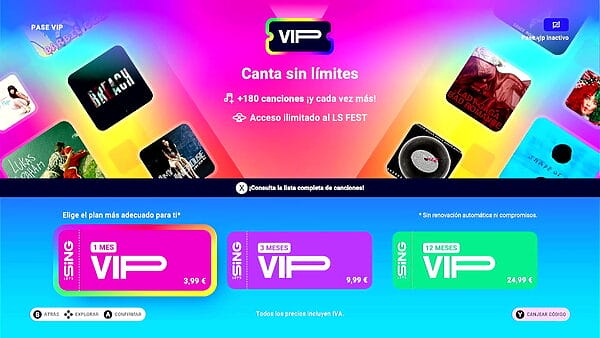 Si con 36 canciones se nos queda corto el repertorio, con el pase VIP, gratuito durante un mes con la adquisición del juego, se amplía hasta llegar a algo más de 180 canciones. Además del mes gratuito, las versiones Gold Edition y Platinum Edition añaden 3 y 12 meses de pase VIP respectivamente. Este pase VIP sirve también para juegos anteriores, o al revés. Por ejemplo, si ya se disponía de la edición de 2024 o 2025, y se tenía activa una subscripción VIP, la misma es válida Let’s Sing 2026. Se ha probado al revés, con el pase VIP del 2026 se ha podido acceder al mismo pase en la versión de 2025. El pase se puede adquirir para periodos de un mes, 3 meses o 12 meses. El pase, al contrario que otras subscripciones, no se renueva automáticamente, lo cual es un punto positivo.