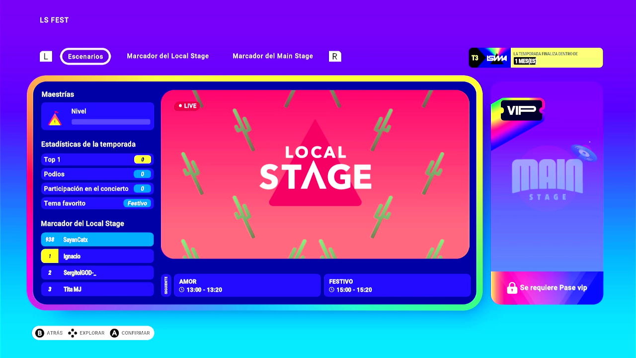 En IS FEST jugamos online contra hasta 30 jugadores. Los jugadores son emparejados en salas y las canciones se suceden en orden aleatorio dentro de la temática asignada. Dicha temática cambia cada 20 minutos. Dentro del modo hay dos submodos, Local Stage, donde se reproducen las canciones incluidas en Let’s Sing 2026, y Main Stage, que requiere el pase VIP. También tenemos marcadores de puntación de cada modo.
