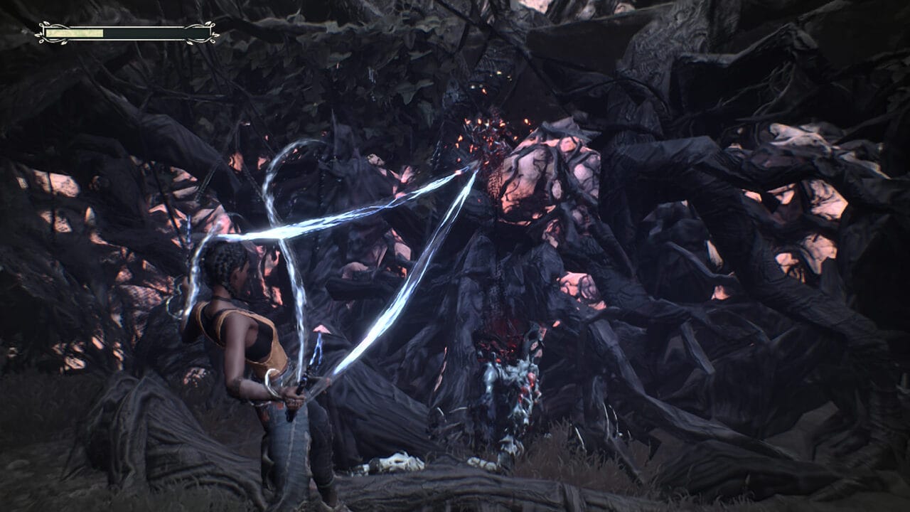 South of Midnight Weaver’s Edition se presenta ante el jugador como una aventura de acción en tercera persona. Hazel cuenta con el típico doble salto, varios tipos de ataques, la posibilidad de planear y un surtido de ataques que, pese a su limitación, logra dar forma a un conjunto de movimientos más que suficiente para enfrentarnos a las diferentes criaturas presentes en la zonas delimitadas para ello. Por desgracia, el surtido de enemigos no resulta demasiado variado y los espacios de combate se limitan a las zonas a «desenredar». Algo que, sumado a un sistema de cámaras no demasiado fino, acaba desembocando en una consistente, aunque sorteable, sensación de repetitividad.