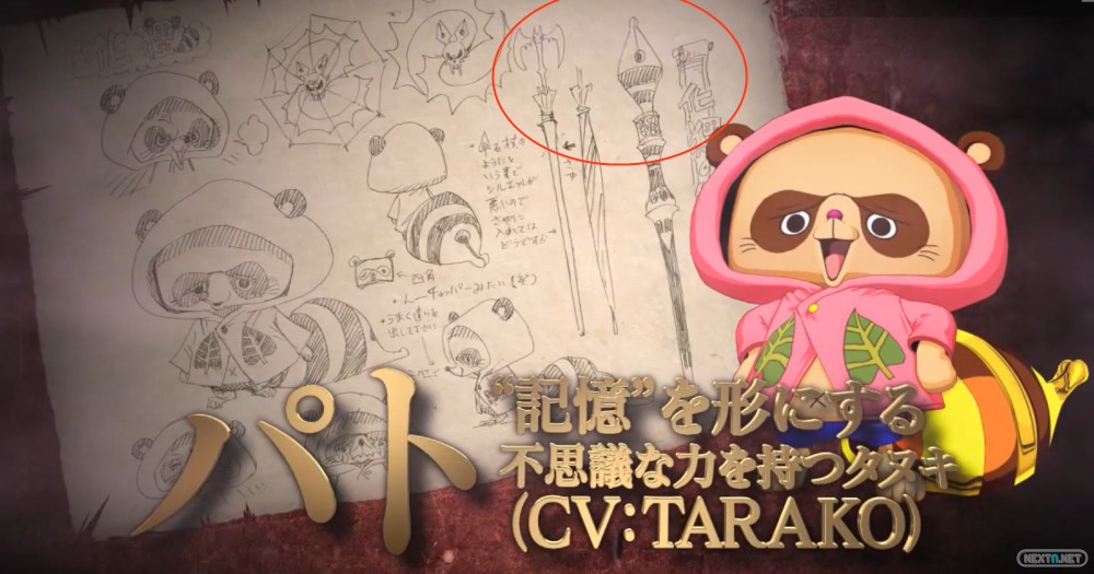 Entre las imágenes que aparecen en los artworks del tráiler (echa un vistazo al final de la noticia), podemos ver una pluma estilográfica al lado de del mapache Tarako y una especie de paraguas con una empuñadura de murciélago. Según vemos en el vídeo, Tarako, como buen mapache, tiene el poder de transformarse, o hacer que aparezcan objetos escribiendo sus nombres en hojas (como por ejemplo, un catalejo). Por cierto, la cola de este personaje posiblemente tenga mucho que ver con su poder.