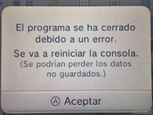 Por último comentar un error que puede que os esté dando a algunos al entrar en la opción de Tienda; nada más seleccionar uno de los cuatro juegos la consola se bloquea por unos segundo, para luego dar paso a una pantalla de error (ver imagen). Decir que en mi 3DS XL, incluso con la revisión 6.0.0-12E que acaban de sacar me da error, incluso apagando la consola, mientras que en una 3DS normal funciona sin problemas. Suponemos que Nintendo sacará otra revisión para solucionar este error.