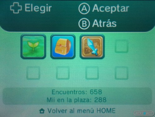Por otro lado tenemos las nuevas opciones: Actualizaciones (botón para actualizar la Plaza Mii de StreetPass, si existen actualizaciones disponibles), Tienda (donde podremos comprar los 4 juegos nuevos), Caseta de Vales (lugar donde podremos canjear los vales obtenidos en los juegos nuevos), y un nuevo botón "Jugar", que nos llevará a una nueva Plaza Mii donde se encontrarán los juegos viejos (En Busca del Cromo y Rescate Mii), así como los 4 nuevos, que no estarán disponibles hasta su compra. En la pantalla táctil tenemos diversos accesos rápidos a los minijuegos que tengamos, en un principio En Busca del Cromo y Rescate Mii, más los que compremos. También hay un botón con el símbolo de un brote que sirve para ir a la pantalla anterior.