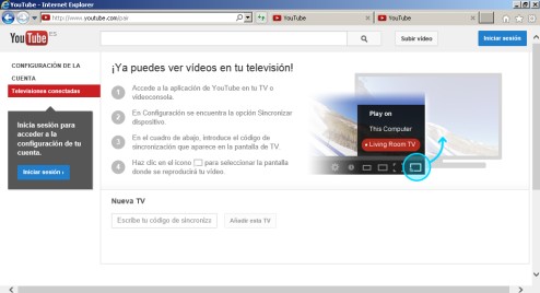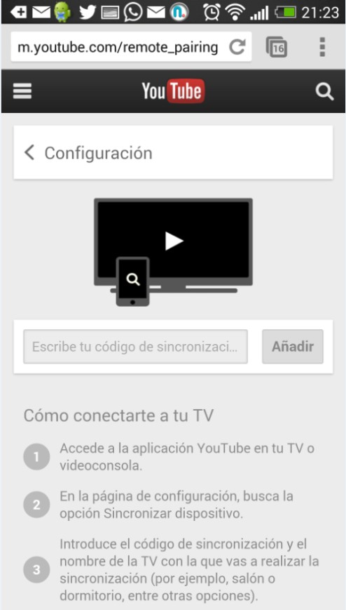 Escribimos la URL youtube.com/pair en la barra de direcciones de nuestro navegador y nos aparecerá una pantalla donde nos pedirá el código de sincronización que nos proporcionó la aplicación.