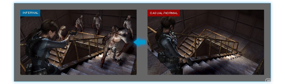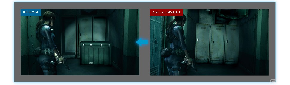 La segunda ronda de imágenes compara el modo Infierno exclusivo de la versión HD de Resident Evil Revelations (más peligros, enemigos y objetivos ubicados aleatoriamente, mayor dificultad, etc.) con el modo normal y casual. Este será un reto que infundirá respeto, ya sólo por el mayor número de enemigos, y posiblemente la mayor escasez de balas.